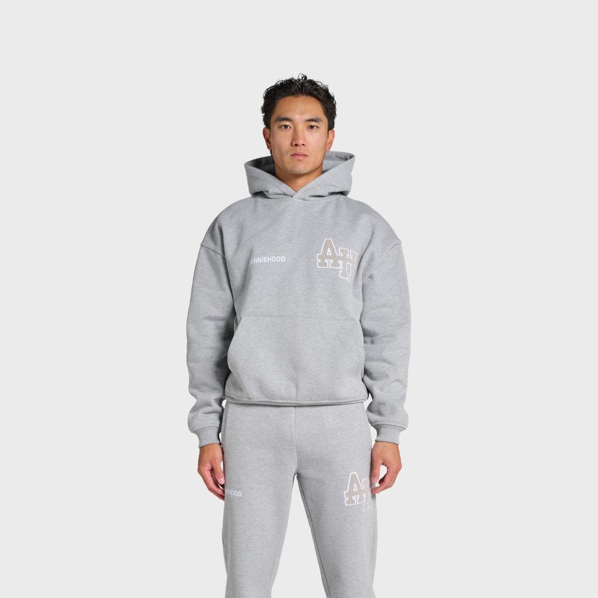 Man wearing grey ANNIE HOOD College Hoody with dropped shoulder and double embroidery logo.