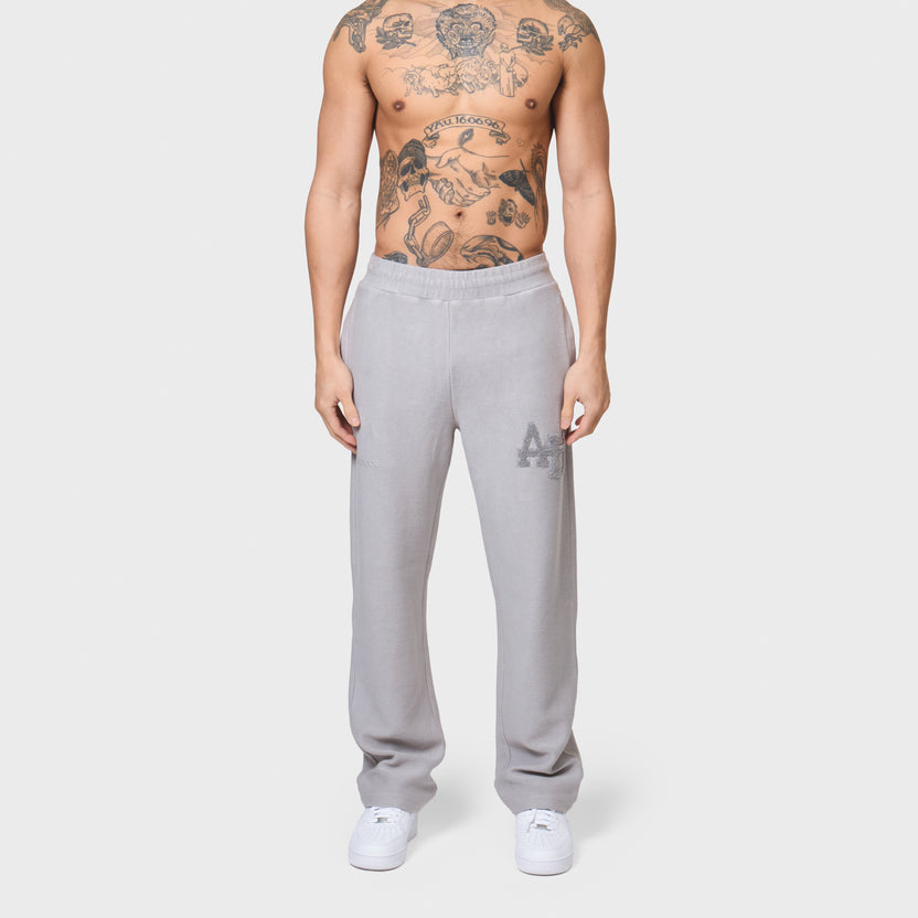 Annie Hood College Joggers in washed grey, 500gsm brushback cotton, relaxed fit on 6'0 model with 31 waist