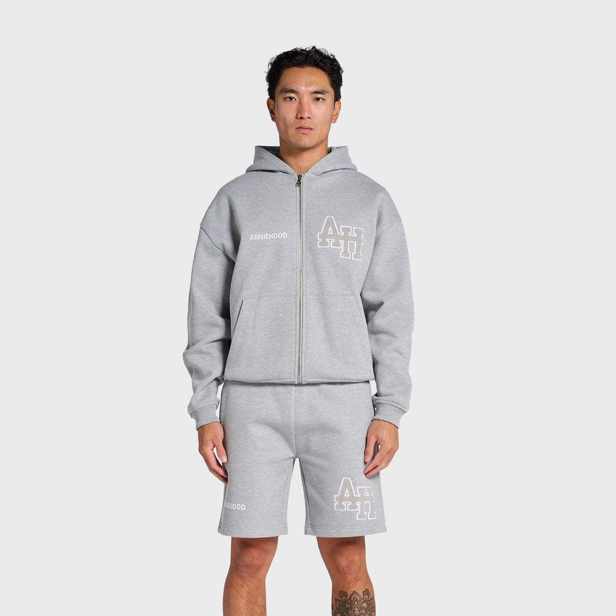 Man wearing grey ANNIE HOOD College Zip hoodie with dropped shoulder and double embroidery logo, paired with matching shorts