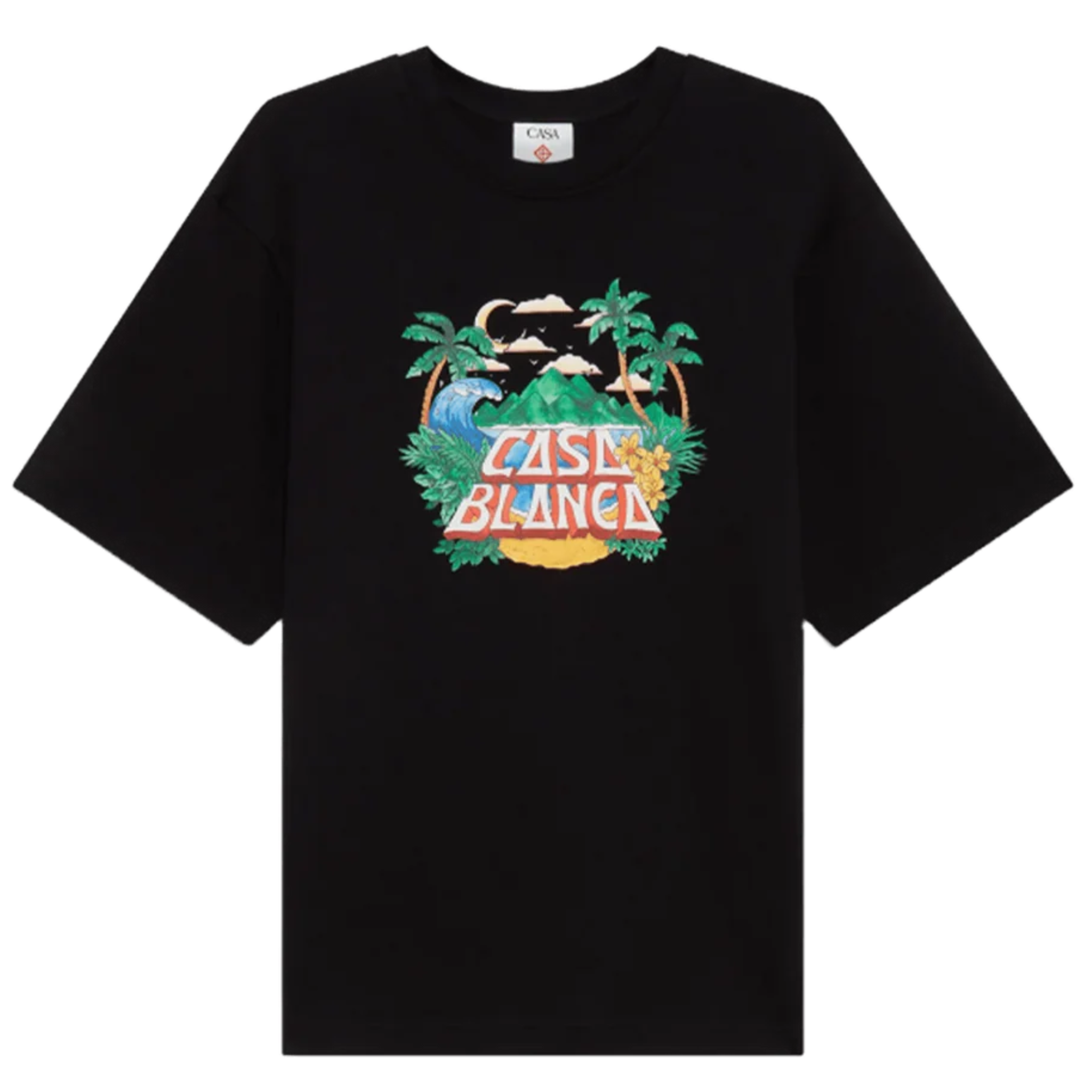 Black Casablanca Beach Wave T-shirt with tropical palm tree and wave graphic design