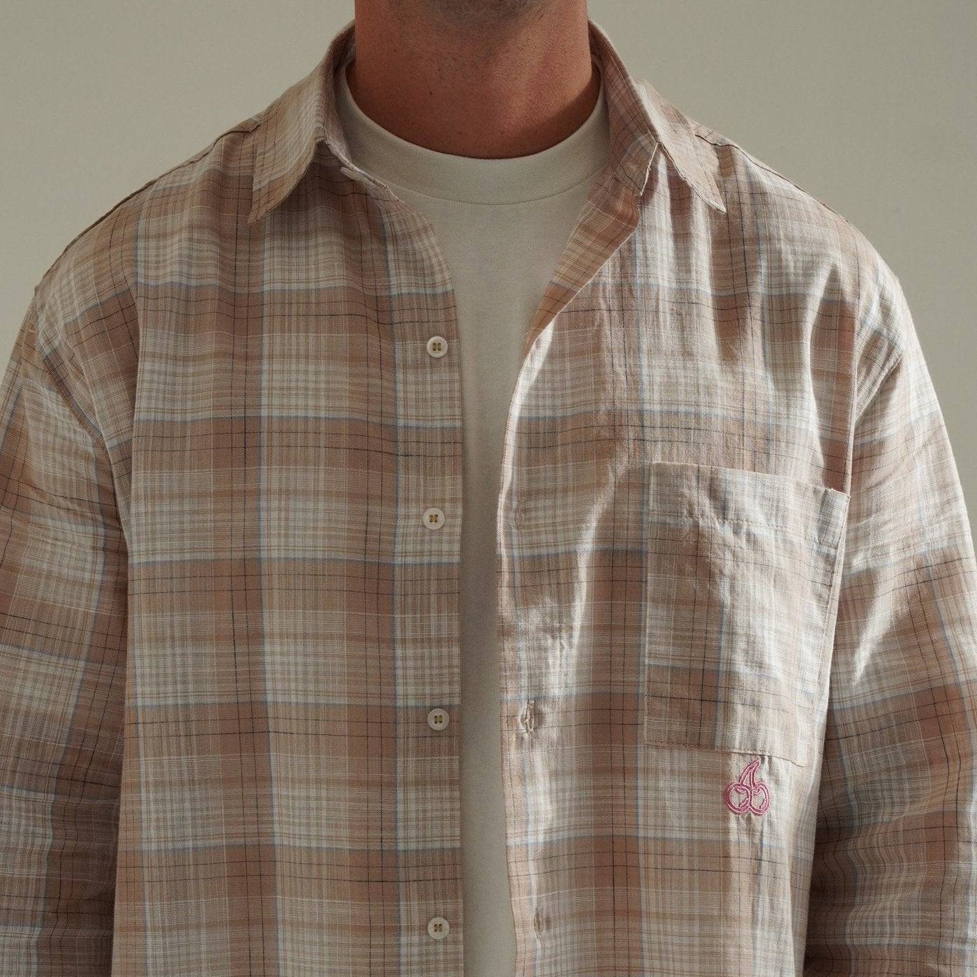 Close-up of Cherry Location Beige Shirt showing beige plaid fabric with blue and brown lines and a pink cherry logo on the pocket