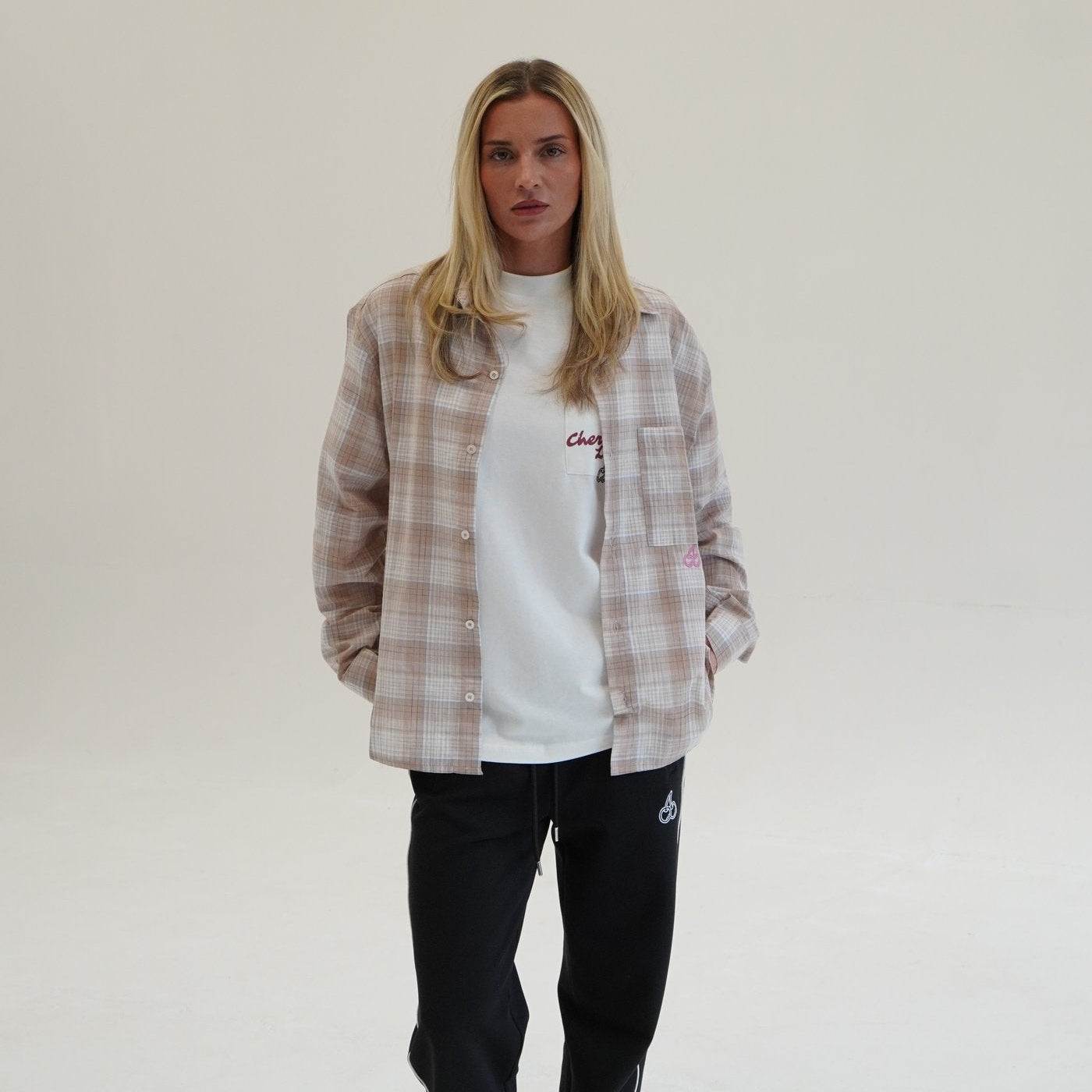 Cherry Location Beige Shirt with plaid pattern and long sleeves
