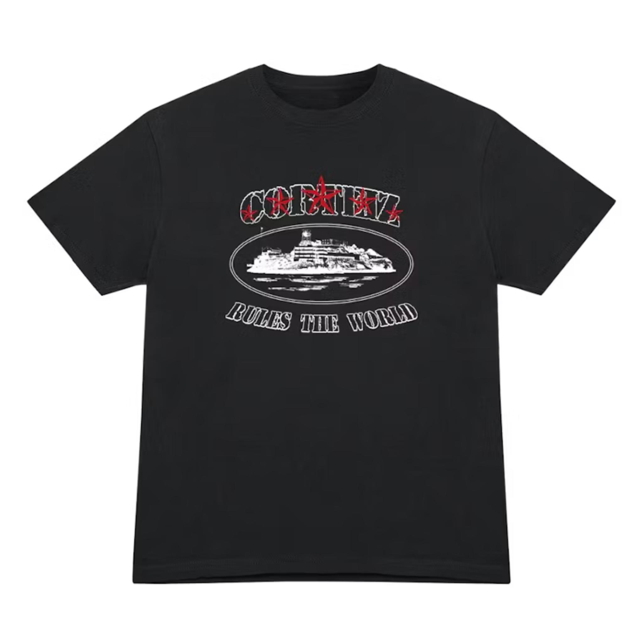 Black Corteiz 5 Starz Alcatraz graphic tee with white and red design and "Rules the World" text