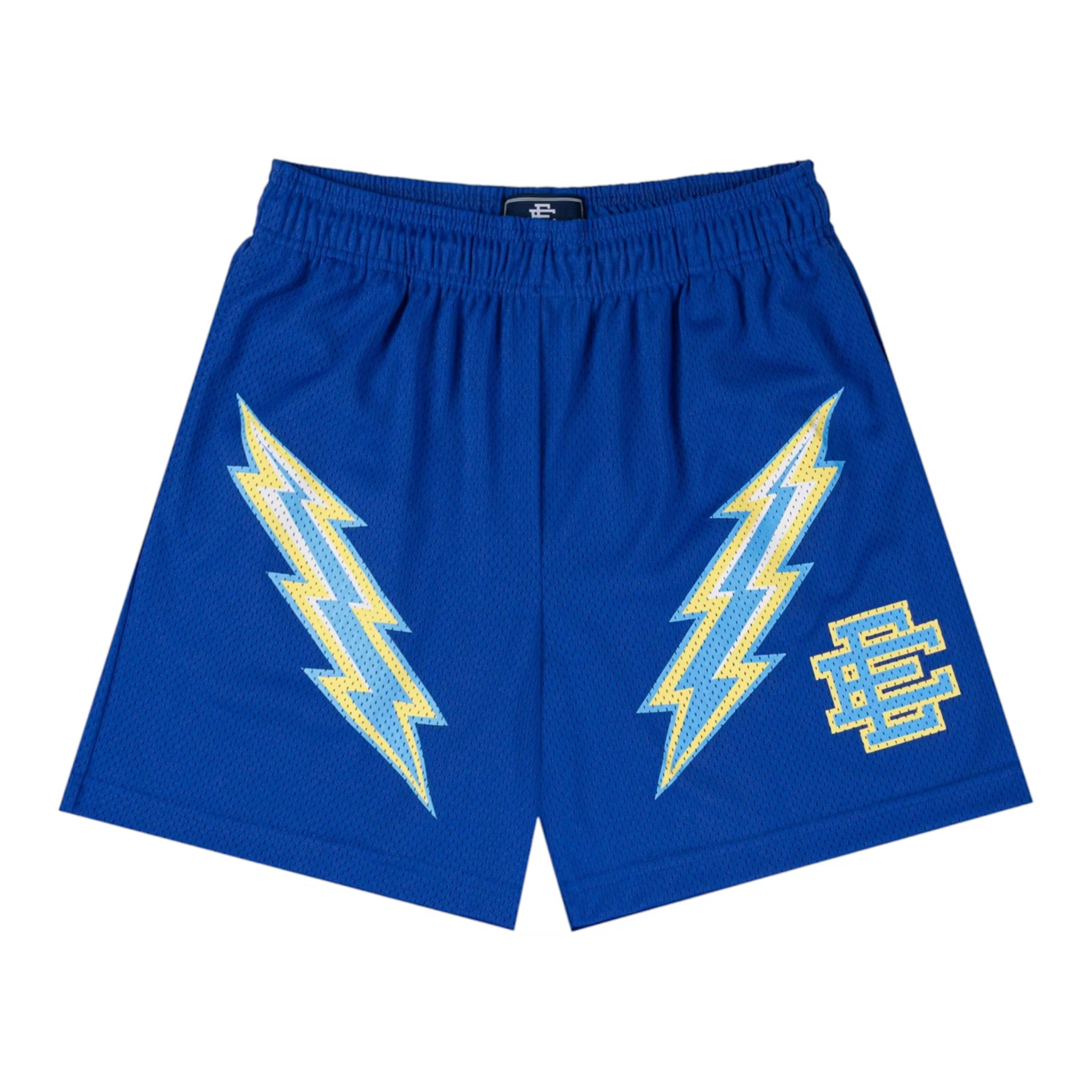 Eric Emanuel EE Basic Short in dazzling blue with yellow lightning bolt design and EE logo