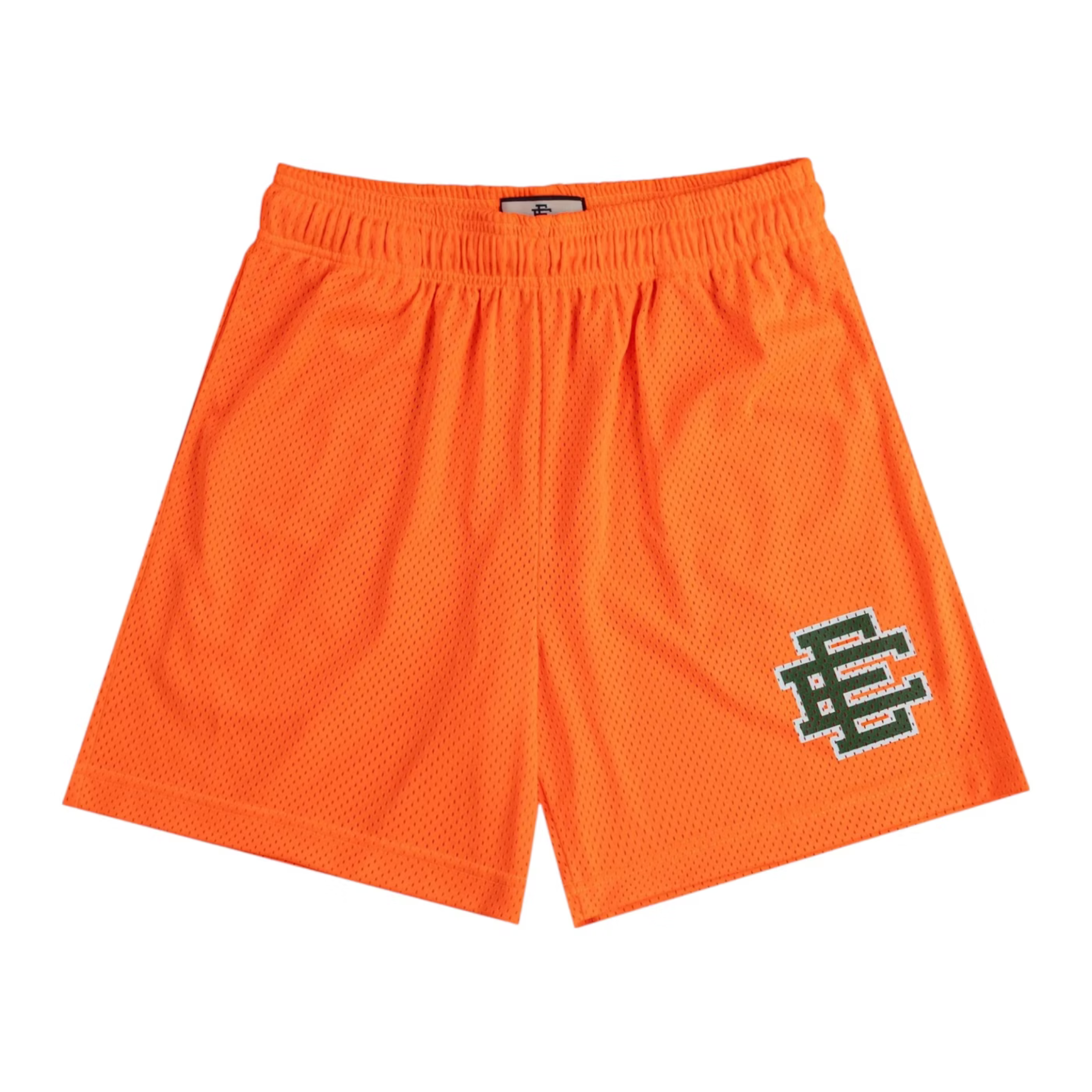 Eric Emanuel orange athletic shorts with green logo and elastic waistband