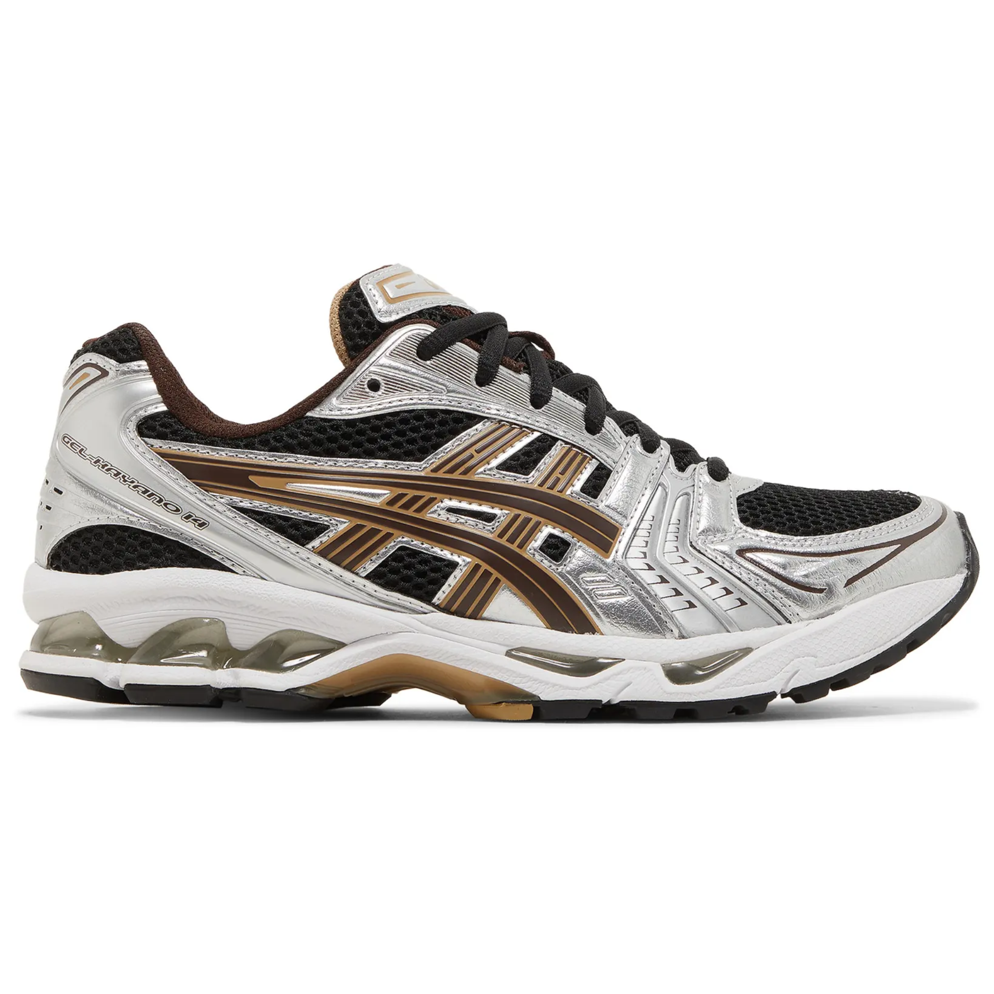 Gel Kayano 14 Black Coffee running shoe with metallic silver and brown design