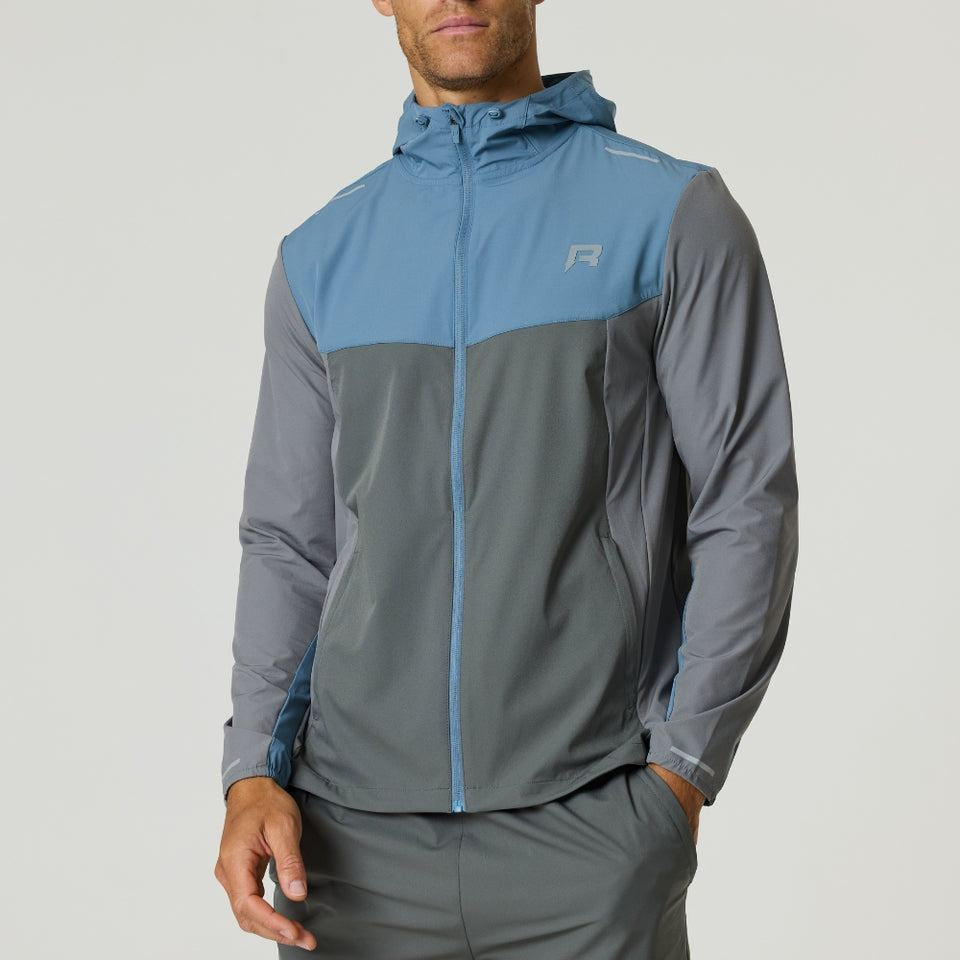 Reprimo Flight Windbreaker in Air Force Blue and Gunmetal, lightweight polyamide jacket with hood and back vent for breathability.