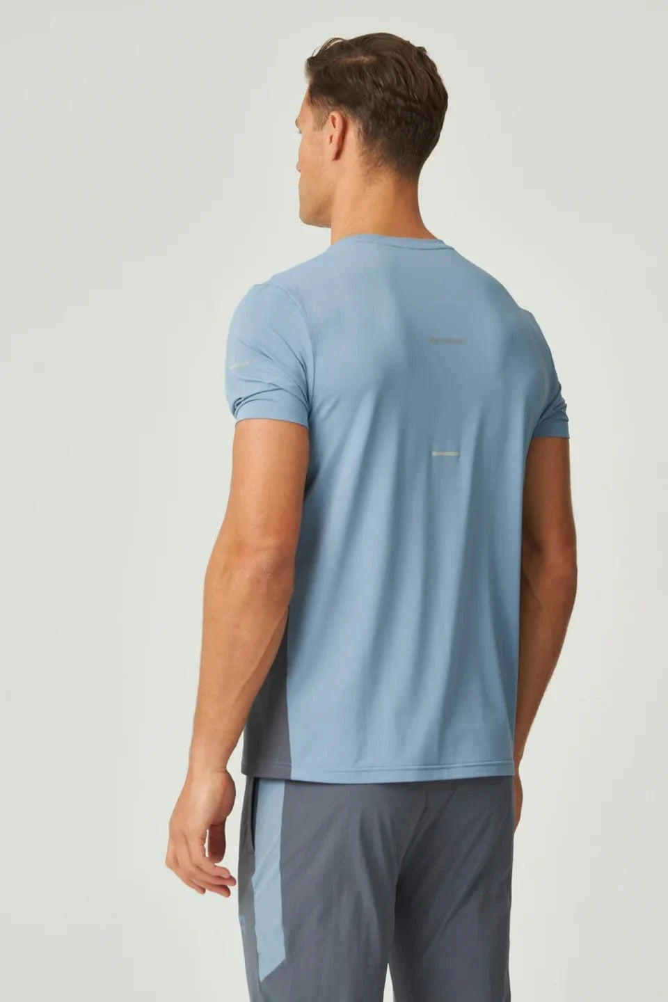 Rear view of man wearing dusky blue Reprimo Vortex T-Shirt with ergonomic panels and lightweight fabric