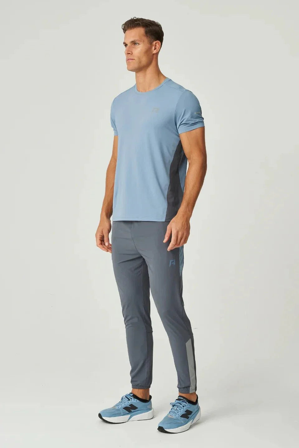Man wearing dusky blue Reprimo Vortex T-Shirt with ergonomic panels and performance fabric