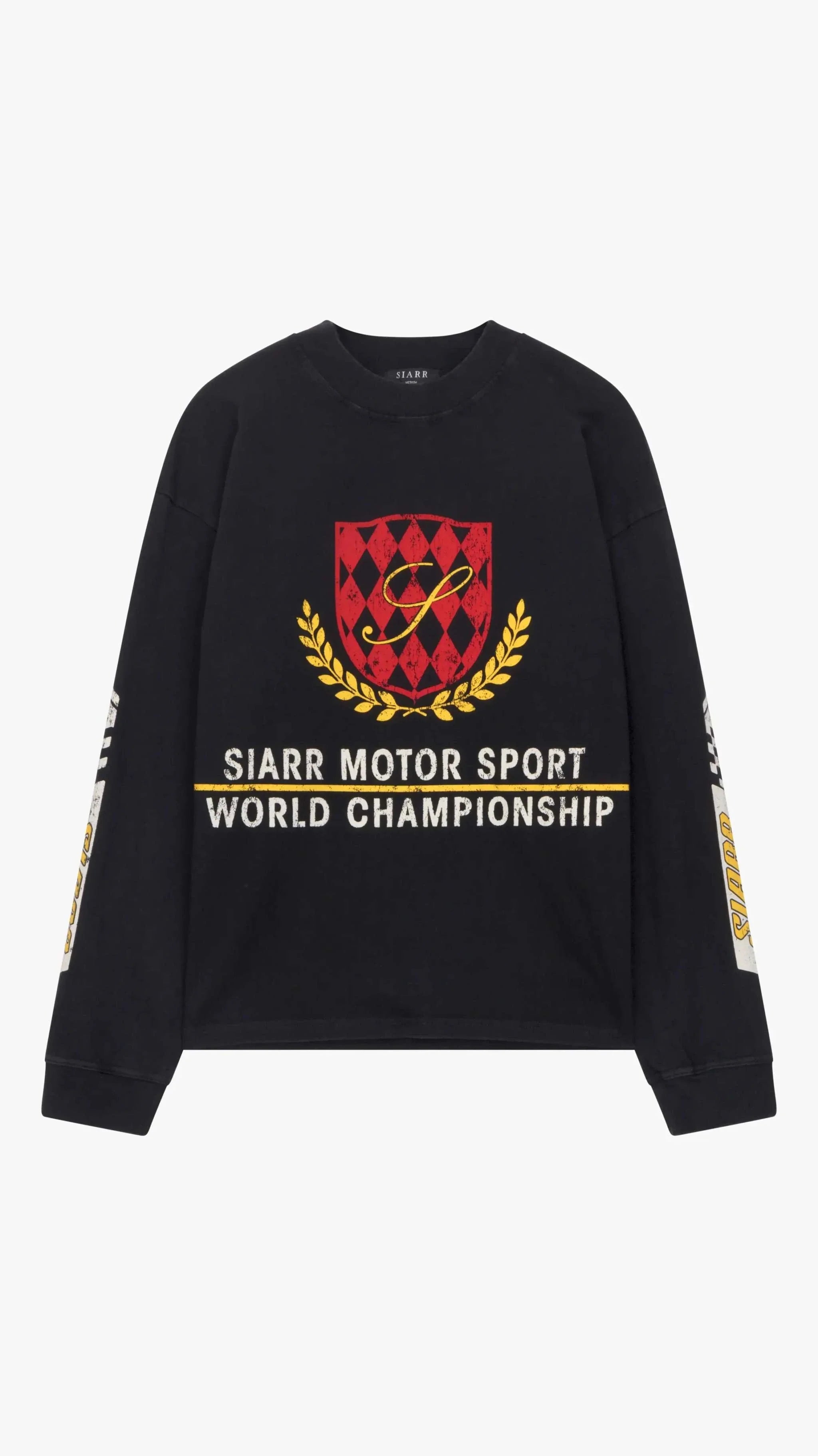 Siarr Motor Sport oversized black long sleeve tee with ribbed neck and screen print in heavyweight cotton