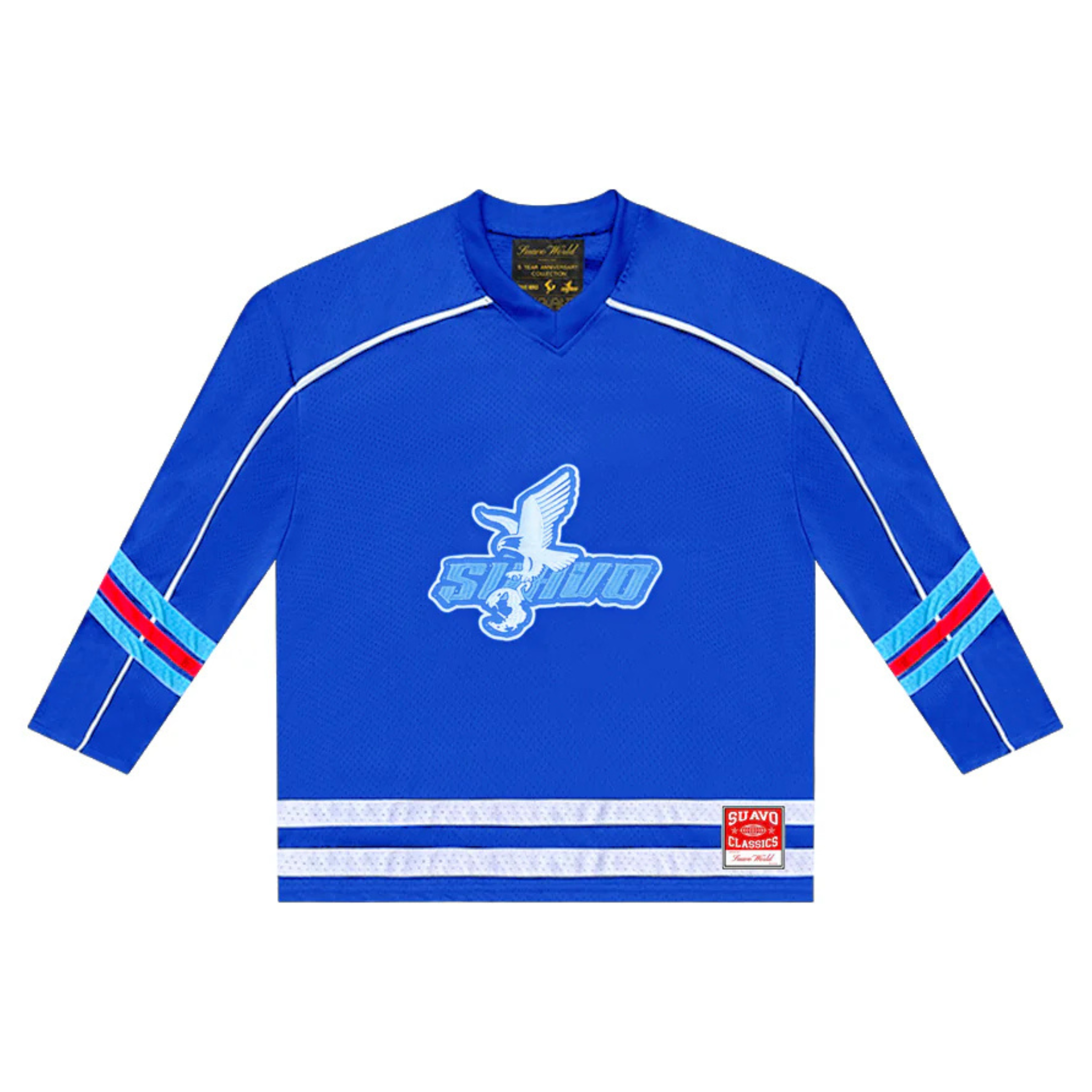 Suavo World Eagle blue mesh longsleeve jersey with eagle logo and striped sleeves