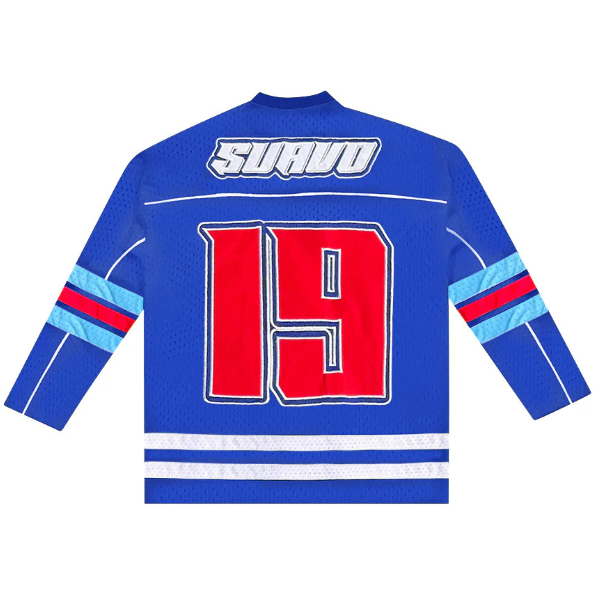 Blue Suavo World Eagle mesh jersey longsleeve with red number 19 and light blue and red stripes on sleeves