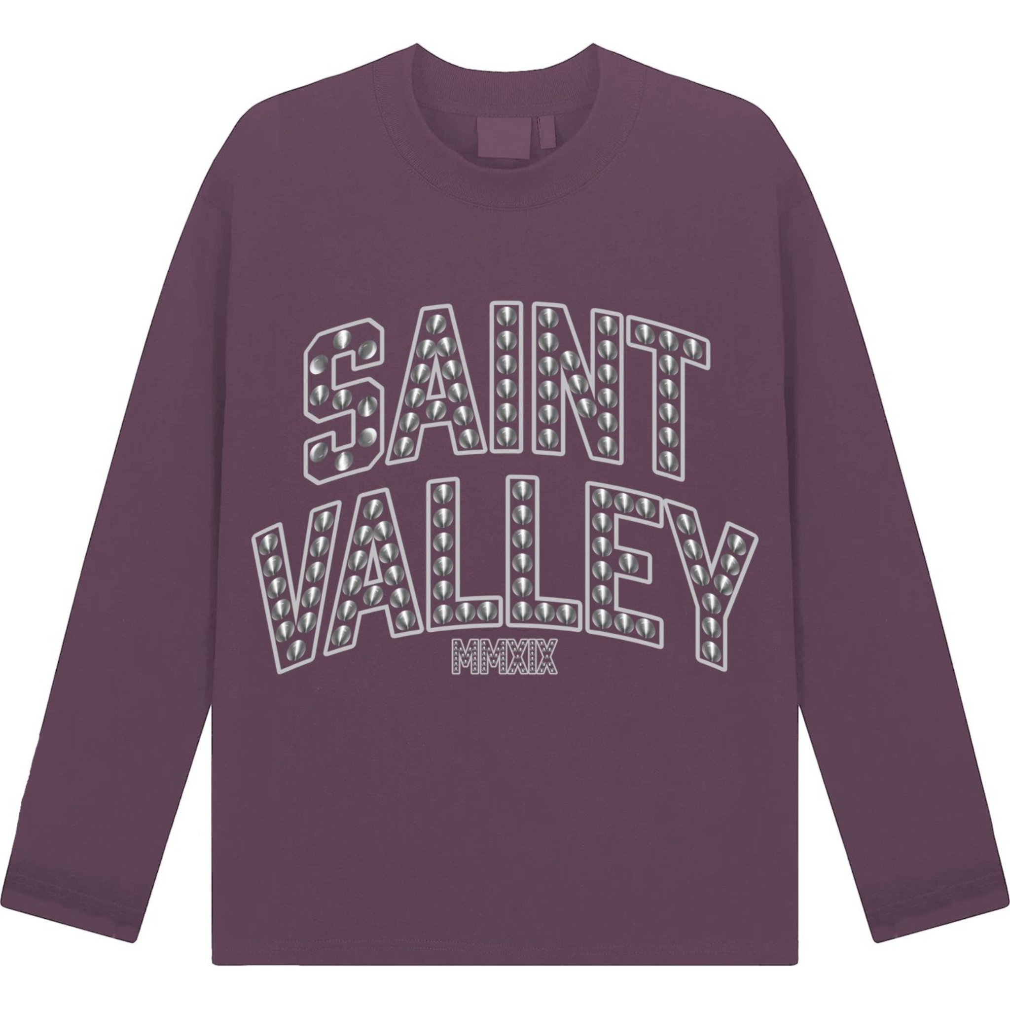 Suavo World purple long sleeve t-shirt with "Saint Valley" embellished text design