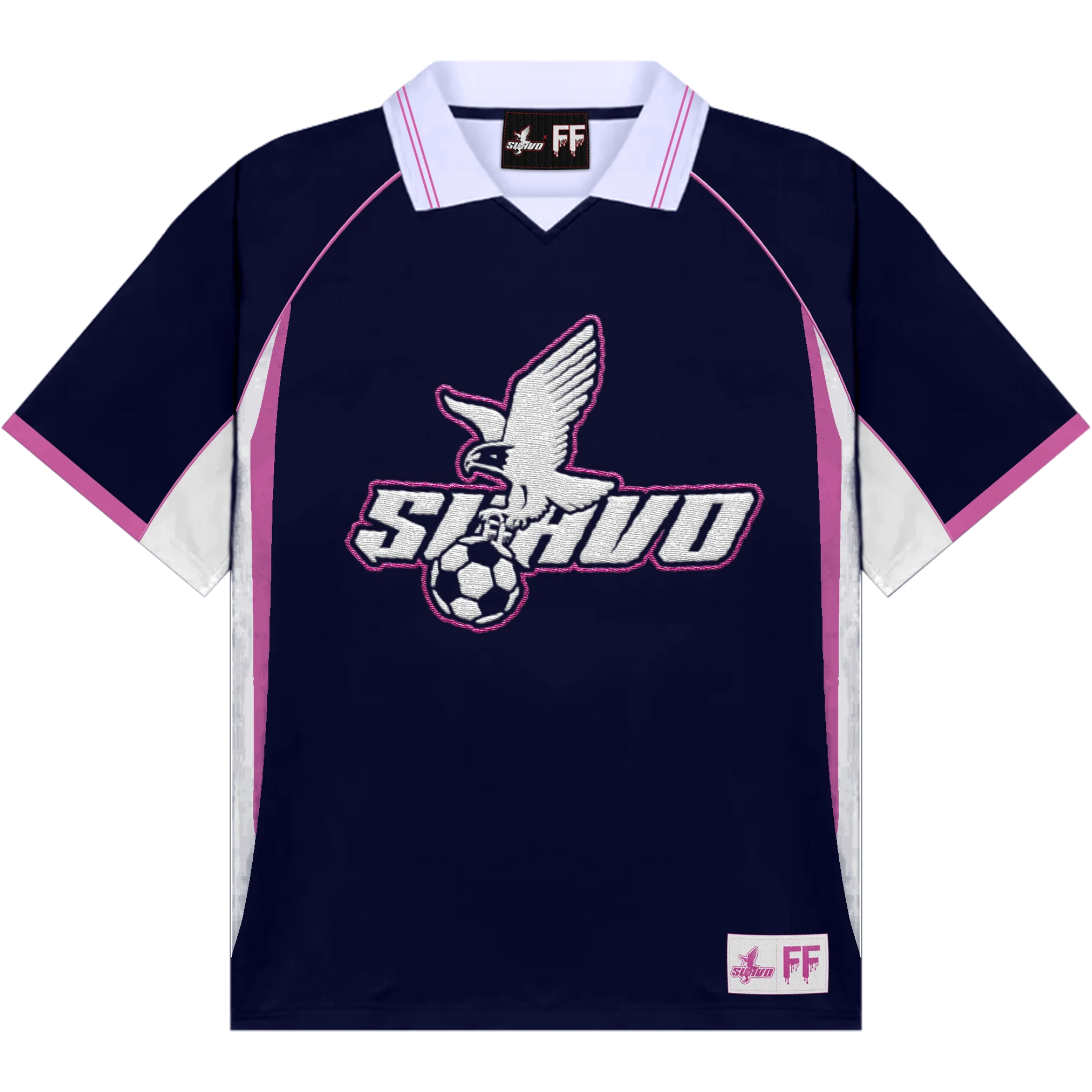 Suavo World navy football jersey with white and pink accents and eagle logo