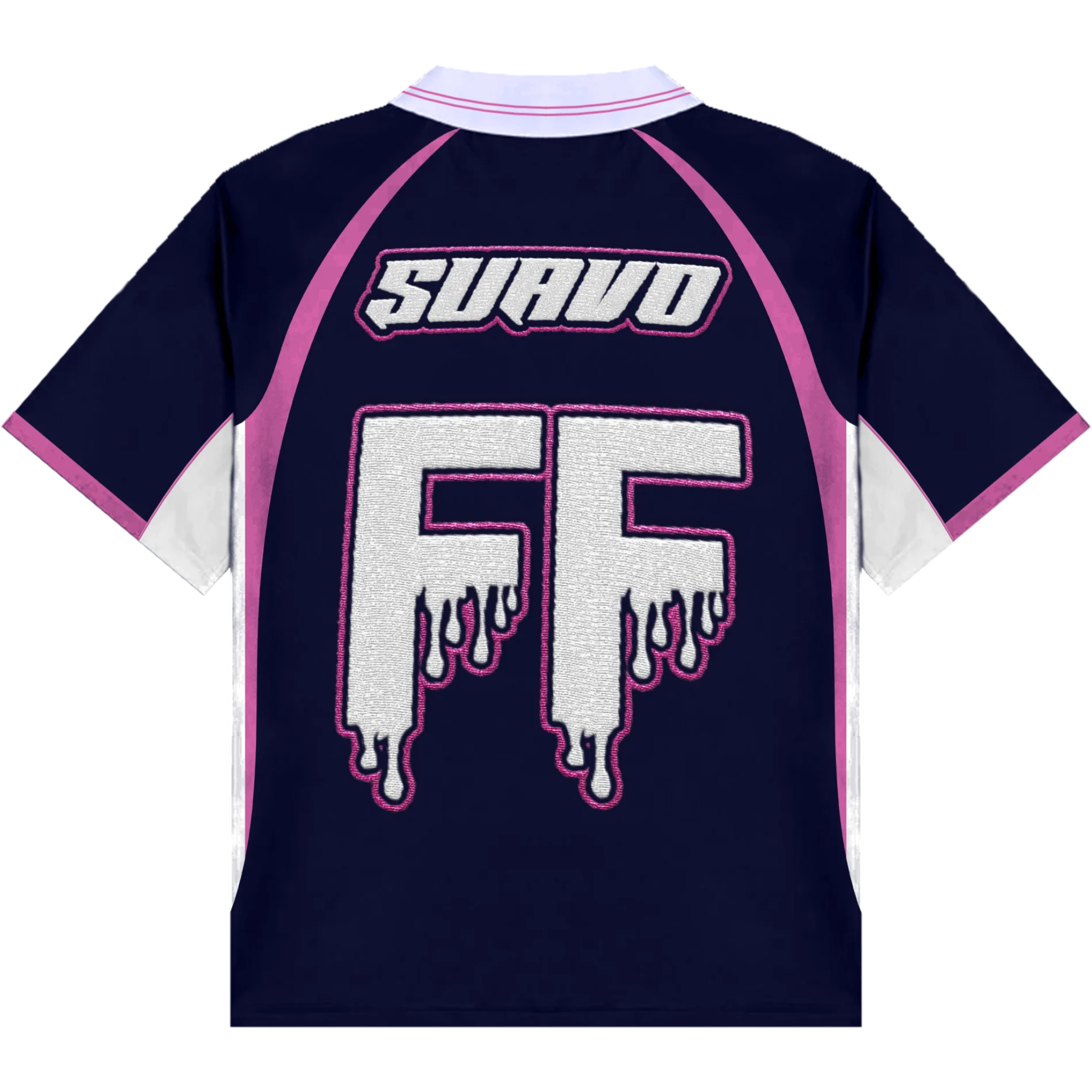 Suavo World x Footballer Fits navy jersey with dripping white "FF" graphic and pink accents